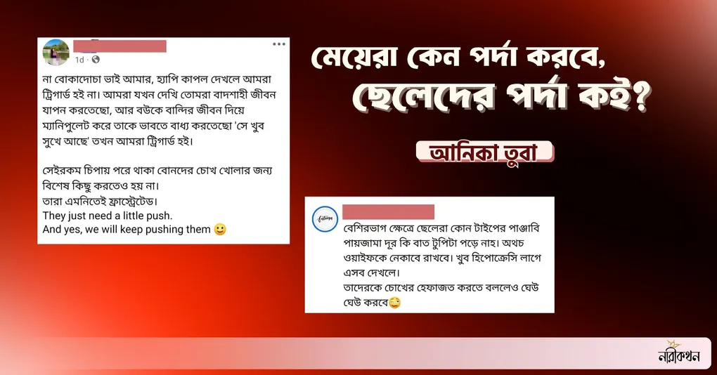 ফেমিনিস্ট নারীদের একটা বিরাট অভিযোগ কেন মেয়েরা পর্দা করবে, ওদিকে ছেলেরা শার্ট-প্যান্ট পরে ঘুরবে? তারমানে হলো, মুসলিম নারীরা যারা হিজাব, নিকাব, বোরকা পরে, তারা আসলে “পুরুষদের” দ্বারা জুলুমের শিকার। পুরুষরাই জোর করে মেয়েদের পর্দা করায়, আর নিজেরা মজা করে যা খুশি পোশাক পরে, যেভাবে মন চায় চলে। এজন্যই ফেমিনিস্ট নারীদের চোখে ‘মুসলিম পুরুষ’ মানেই হিপোক্রেট, জালেম। আর মুসলিম নারীর জীবন মানেই ‘বান্দীর জীবন’।